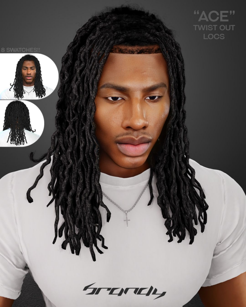 A bold hairstyle made of twisted locs combined with a sharp fade. Ideal for urban male Sims who appreciate style and personality. It comes in several natural shades and adds a realistic touch to CAS.